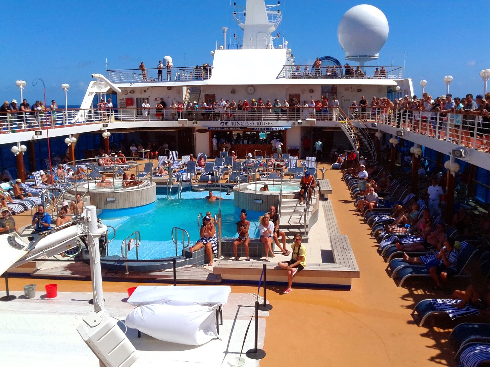 We weren't particularly keen on that happening so went up on a higher deck to watch. It must be a fairly set formula - King Neptune arriving with his entourage to hold a mock court and sentence a number of selected miscreants. There was someone charged with gluttony for attending every sitting of every meal, a couple charged with PDAs in the spa pool and various other equally ridiculous things.